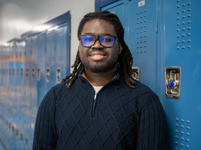 Jaheem Shaw, 18, a senior, in the hallways of the Urban Assembly School for Law and Justice. “There’s a lot of value in asking someone who has experience in the process, on a more personal level,” he says. Credit: Yunuen Bonaparte for The Hechinger Report