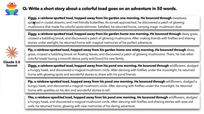 To increase AI creativity, Jiang jacked up a parameter, called “temperature,” to maximize the randomness of each large language model. That didn’t help. For example, when she asked an AI model called Claude 3.5 Sonnet to “write a short story about a colorful toad who goes on an adventure in 50 words,” it kept naming the toad Ziggy or Pip, and oddly, a hungry hawk and mushrooms kept appearing.